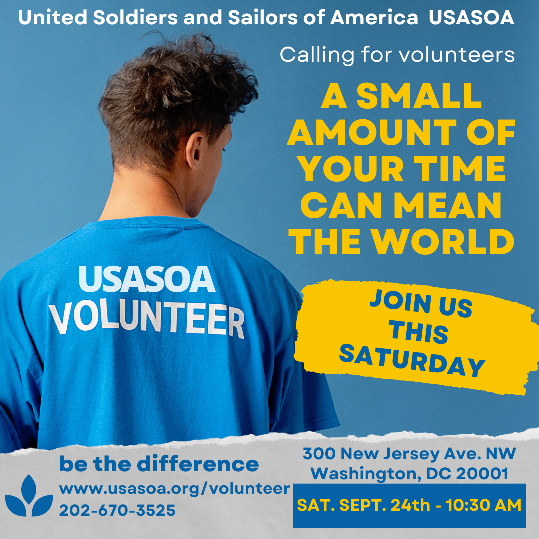 Volunteer with United Soldiers and Sailors of America - Usasoa and make a difference in the lives of veterans, service members, and their families. Take a look at our grassroots programs and services and join us this Saturday, Sept. 24th - at 10:30 am in our Capitol Hill office. Refreshments served. Stick around after the meeting and help deliver food and care packages to homeless and hungry veterans in the DC area. Sign up so we know you will be attending: https://www.usasoa.org/volunteer