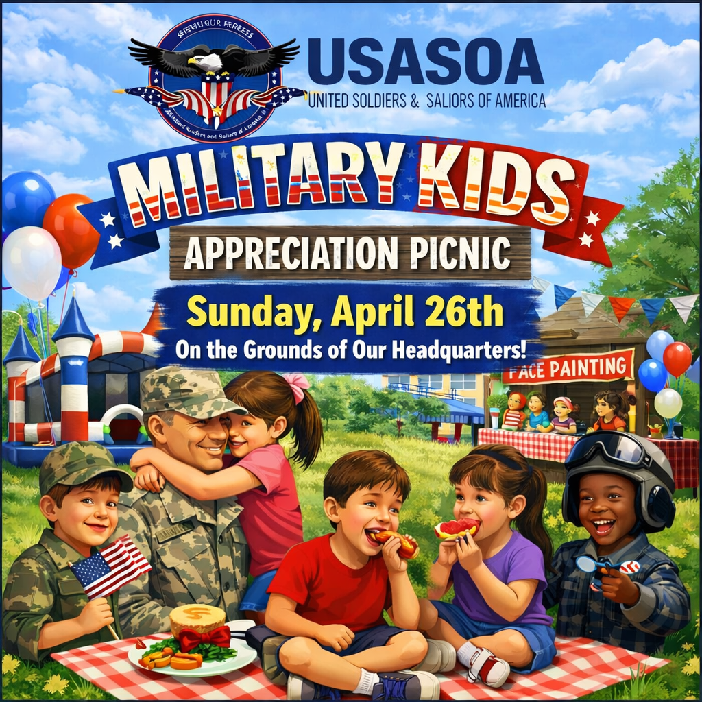 April is the Month of the Military Child! USASOA is proud to celebrate the strength, resilience, and spirit of our military kids with a Military Kids Appreciation Picnic right here on the grounds of our headquarters on Sunday April 26 from noon till 5 pm. Bring the whole family out for a day filled with food trucks, great food, drinks, face painting, cotton candy, bouncy houses, games, and more—all designed to give our youngest heroes a day of joy and laughter. In a world that feels heavy with conflict, uncertainty, and sorrow, this event is our way of bringing light, hope, and togetherness to our troops and their families. These children serve too, and they deserve a day that’s all about them. Register to bring your family by completing the form below. Let’s come together as a community and make this a day they’ll never forget